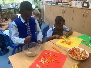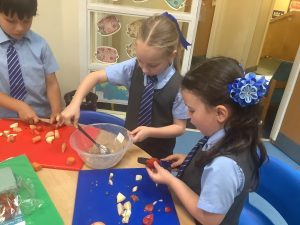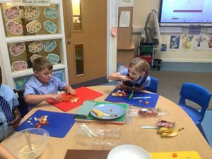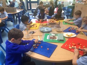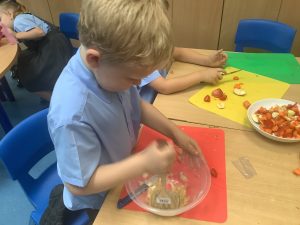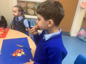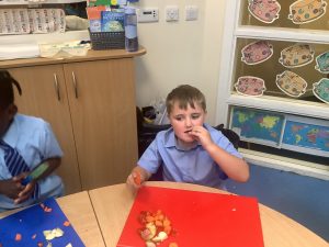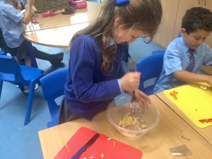 During DT, we have been learning all about a healthy, balanced diet. Today, we tasted a range of different foods, we used our senses to also smell and feel them. We then practiced our cutting skills and used a masher to make a dip!
